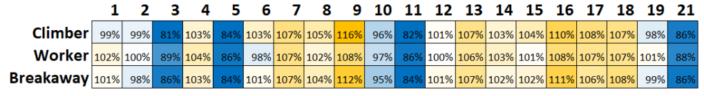 You can see the whole peloton got a break on stages 3, 5, 11, and 21 with all of the groups having much lower average power outputs. Climbers posted their peak relative power output in Stage 9 at 16% higher than their Tour average. Breakaway men peaked in Stages 9 and 16. Workers peaked in relative power on the difficult mountain days between stages 16-18, but also had to generate equal effort in Stage 7. Interestingly, the workers had less variable power outputs overall with a standard deviation of 7% vs 9-10% for the other two groups of riders.