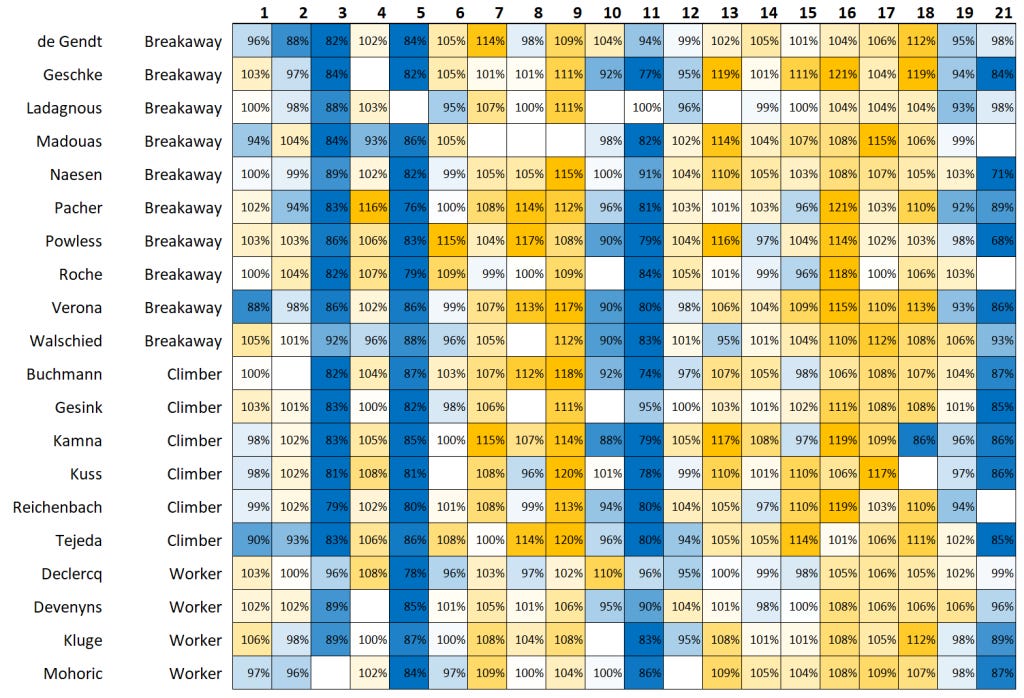 Of Velofacts's 60 some riders I've chosen 33 of the most interesting riders who made an impact on the Tour and calculated their relative power output (each stage divided by their race average). I've also classified them roughly into three groups to show what role they played in the race; guys like Dries Devenyns, Roger Kluge, and Tim Declercq were 'Workers', Sepp Kuss, Harold Tejeda, and Reichenbach were 'Climbers', and Simon Geschke, Quentin Pacher, and Carlos Verona were 'Breakaway'.