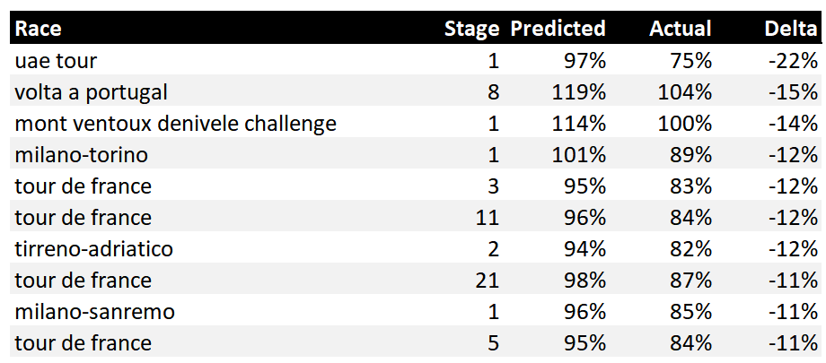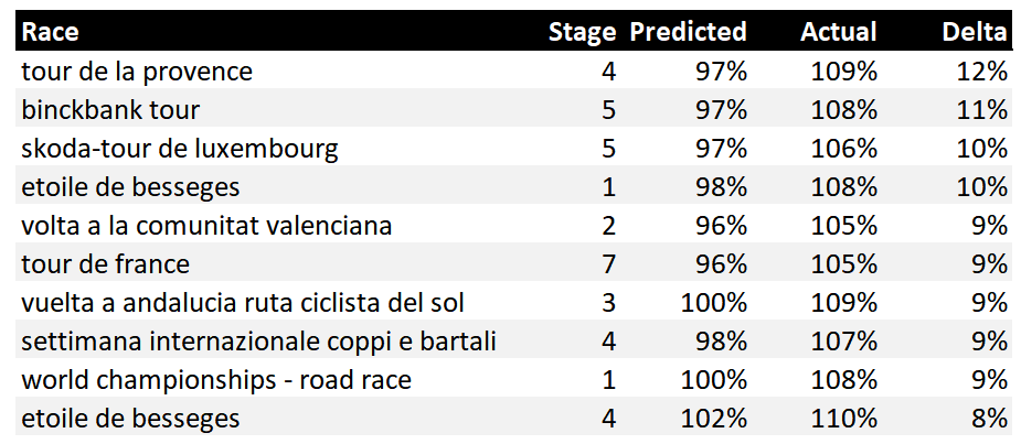 The highest road race prediction was Pierre Latour at Mont Ventoux Challenge - a one day race with two significant climbs where Latour finished 4th. The prediction was 118.5% of Latour's average normalized power, but he only produced 105%. The residuals for ten riders with power files from that raced showed it as the 3rd largest negative difference between predicted and actual power - indicating the race required much less power than predicted by the model.
