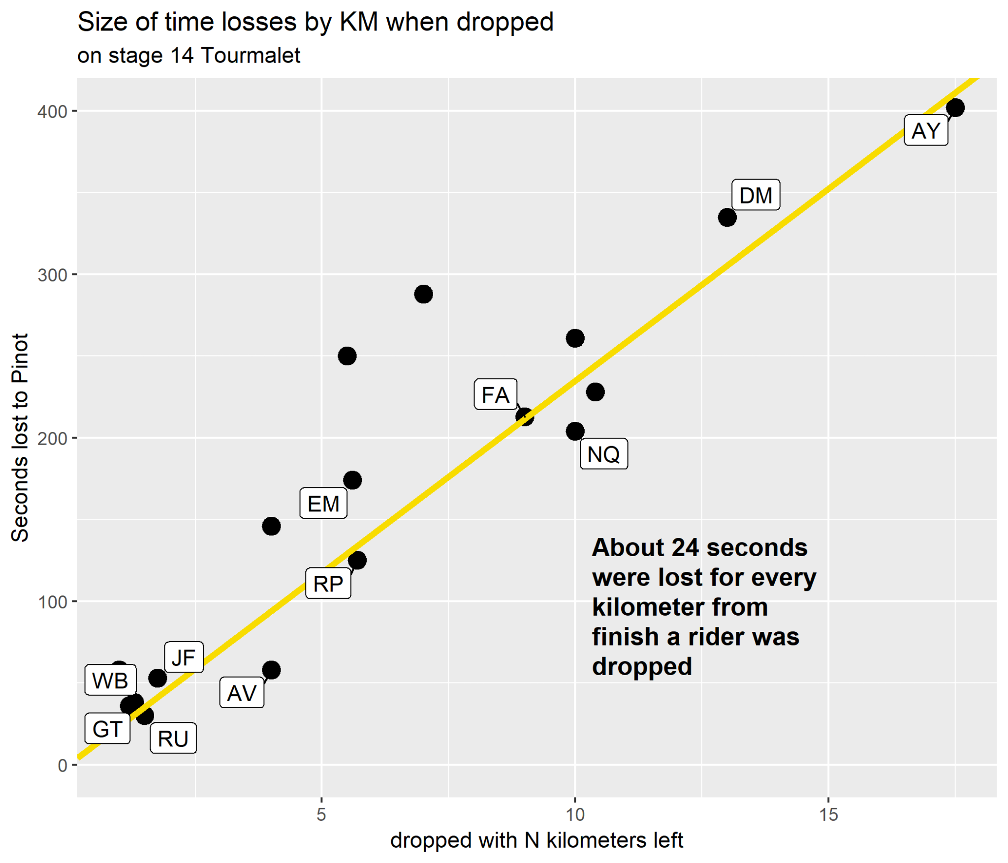 Below is a graph of time losses to Pinot based on what KM a rider was dropped from contact with the yellow jersey (eg, Thomas around 1.2 km, Richie Porte around 5.5-6km, etc). The regression line using just GC contenders (not domestiques like Gaudu/de Plus) shows each kilometer you survived today was worth about 24 seconds.