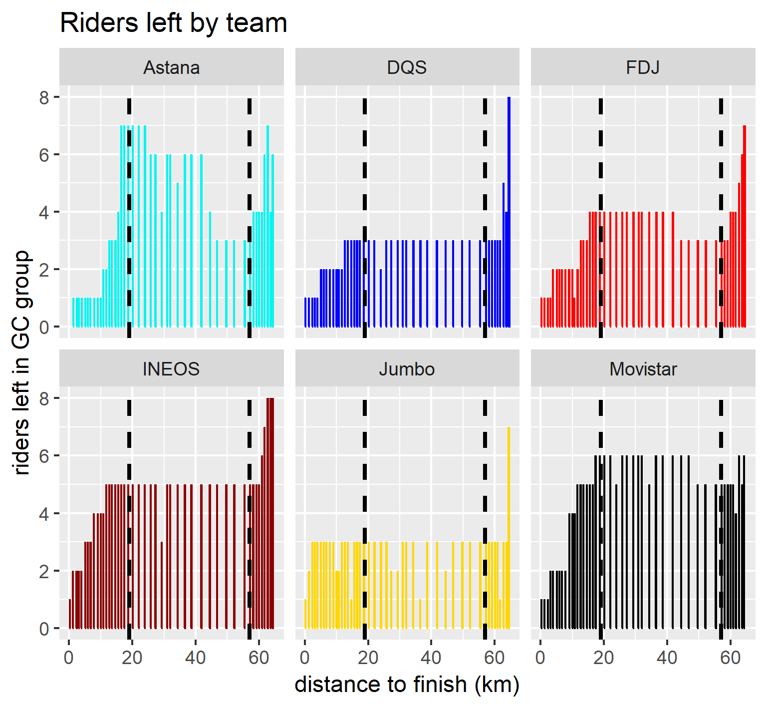 3). INEOS looks to have taken a step-back. We don't have data on how many riders they could keep in the final group from past Tours, but in stage 6 they had just one man left with Thomas/Bernal with 5km to go and today they had lost everyone by that point. Both Wout Poels (stage 6) and Michal Kwiatkowski (stage 14) have been dropped on the penultimate climb when Movistar raised the pace.